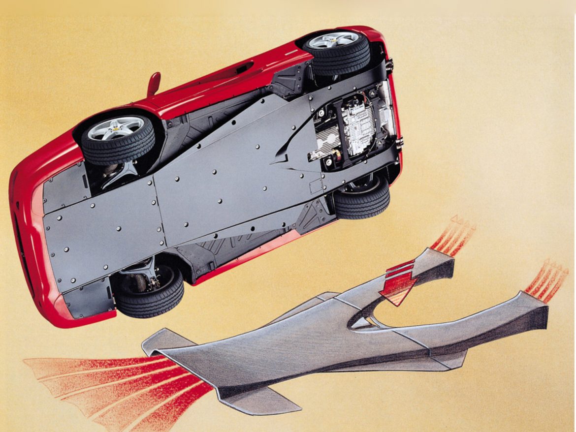 Después de que a principios de los 90 los 348 se labraran cierta fama entre la prensa, y no precisamente buena, el F355, antes de nacer incluso, cargaba con una presión y una responsabilidad enorme. No obstante, tras su lanzamiento estuvo más que a la altura de la reivindicación exigida, y se puede decir que gran parte de su ADN procede de la extensa experiencia adquirida por la marca en la Fórmula 1. Sus 1300 horas en el túnel de viento le avalan. Este es un Ferrari con una concepción tan perfecta, que sus formas, sumadas a unos bajos completamente carenados, proporcionan un efecto suelo tan eficiente que ni siquiera fue necesario sumarle ningún tipo de alerón a su carrocería.